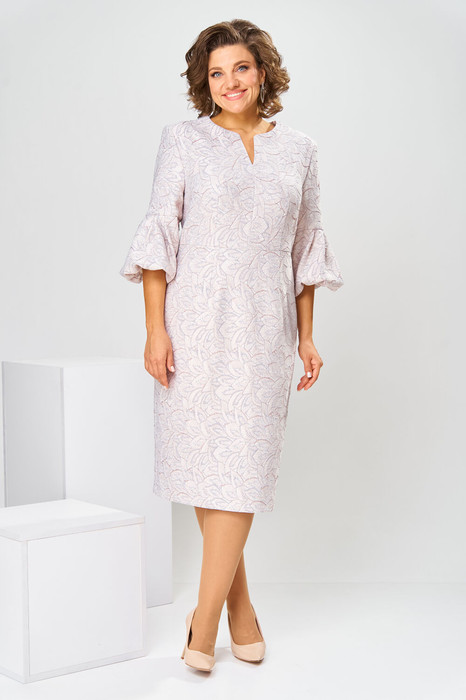 Платье женское, относится к торжественной нарядной одежде. Платье женское, полу прилегающего силуэта, длиной ниже колена. Перед отрезной по линии талии. Верхняя часть переда со средним швом и 2-мя таллиевыми вытачками, нижняя часть с 2-мя таллиевыми вытачками. Спинка с 2-мя таллиевыми вытачками и средним швом, заканчивающимся шлицей. Горловина фигурная, обточная, без воротника. Застёжка на потайную тесьму-молнию в среднем шве спинки. Рукав втачной, одно шовный, длиной 3/4, с горизонтальным разрезом, нижняя часть рукава с 5-ю односторонними складками, со сборкой по низу, низ обточной. Платье на подкладке с плечевыми накладками. Длина спинки платье 111 см, длина рукава 45 см.