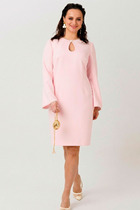 Платье женское, предназначено для повседневной носки. Платье женское, полу прилегающего силуэта, длиной за колено. Перед отрезной, ниже линии талии на 6 см; верхняя часть переда с 2-мя нагрудными выточками и средним швом, нижняя часть с отрезным бочком, шов соединения ею с передом, заканчивается шлицей, фиксирующейся на 3-и обмётанные петли и 3-и пришивные пуговицы; шов соединения часть переда декорирован 2-мя клапанами с закруглёнными концами закреплены на перед пришивными пуговицами. Спинка отрезная ниже линии талии на 6 см; верхняя часть с 2-мя таллиевыми вытачками и средним швом, нижняя часть с 2-мя таллиевыми выточками. Горловина с фигурным вырезом, обтачная без воротника. Платье со спущенным плечом. Рукам втачной, одно шовный, длиной за локоть. Платье без плечевых накладок. Длина спинки 105 см. Длина рукава+плечо 48 см.