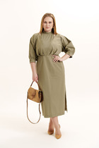 Платье относится к нарядной торжественной одежде. Платье женское, полу прилегающего силуэта, длиной до нижней части икры, расширенное к низу, выполнено в виде имитации костюма. Перед с 2-мя нагрудными вытачками, с отлетной верхней частью из отделочной ткани, с отрезным бочком в левой нижней части платья; шов соединения с треугольной вставкой из отделочной ткани, такими же вставками декорированы и боковые швы. Спинка со средним швом и 2-мя таллиевыми вытачками с отлетной верхней частью из отделочной ткани. Горловина круглая, обточная, без воротника. Рукав короткий, втачной, одно шовный, из отделочной ткани. Платье без плечевых накладок. Длина спинки платья 136 см, длина рукава 23 см.