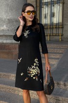 Двубортное платье из костюмной ткани на подкладке. Силуэт платья-слегка приталенный.По переду - нагрудные вытачки, по спинке -рельефы. Бочки, смещенные к переду, делают удобным расположение карманов в швах. Воротник - отложными лацканами пиджачного типа. Рукава - двухшовные, длинные, со шлицей и 2 пуговицами. Жакет застегивается на 2 основные пуговицы, 1 потайную, остальные пуговицы несут декоративный характер.