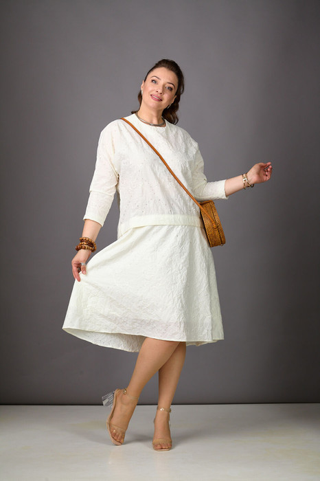 Ах, какая находка - платье из шикарного жатого хлопка с вышивкой! Легкое, невероятно красивое, комфортное платье станет вашим пропуском в лето! Верхняя часть платья «летучая мышь» подойдет любому типу фигуры, расклешенная нижняя добавит легкости. Изюминка платья-разница в длине между передом и спинкой. Рукава трехчетвертные. По спинке - средний шов, молния. Cкрасьте момент с Rosheli!