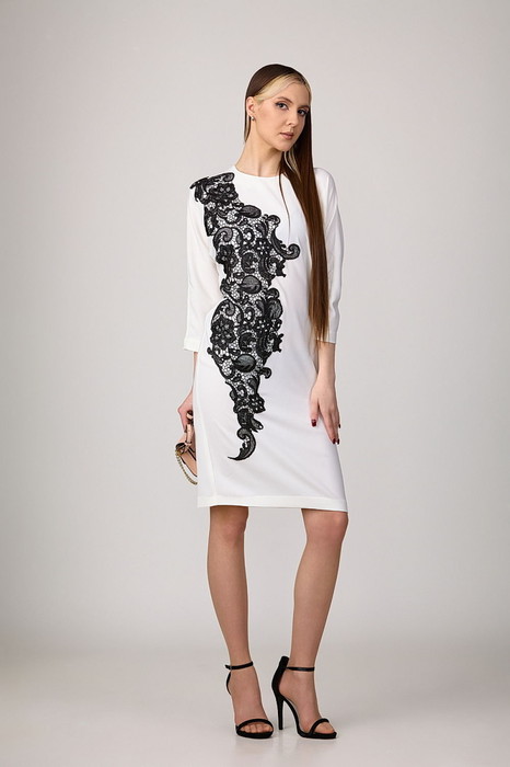 Платье из стрейчевой плательной ткани. Крой «летучая мышь» подойдет для любого типа фигуры и подчеркнет ее достоинства. Изюминка платья - роскошная нашивка из черного кружева. Застежка-молния в среднем шве спинки. Рукава  трехчетвертные.