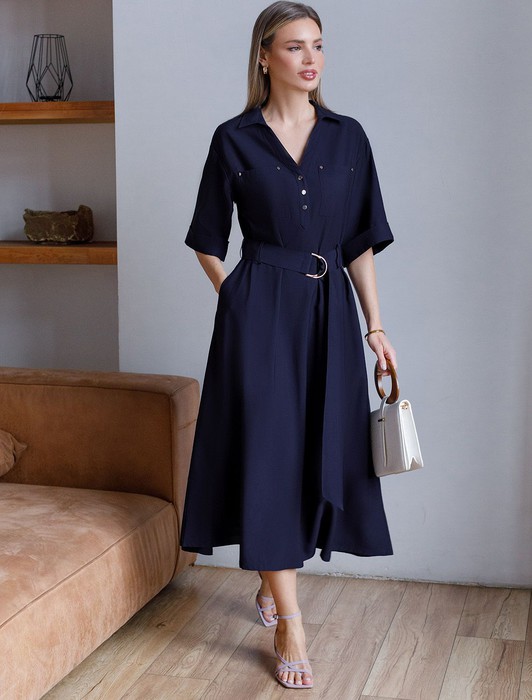 Состав: 92%Лиоцелл (Вис) 8%ПЭПлатье-рубашка темно-синего цвета выполнено из плотного лиоцелла. Лиоцелл это более дорогой и экологичный вариант вискозы, очень прочный и шелковистый. Ткань отличается от регулярной коллекции из лиоцелла - она содержит еще больше лиоцелла (92%), благодаря чему имеет более нежную шелковистую фактуру. Свободное платье трапеция будет идеальным выбором для весны и лета. Отложной воротник добавляет классический акцент, широкий пояс с металлической пряжкой подчеркивает талию, делая силуэт выразительным и женственным. Платье с широким рукавом средней длины смотрится современно, карманы и пуговицы добавляют практичности. Платье А-силуэта идеально сядет и на большие размеры, скроет возможные недостатки и подчеркнет достоинства фигуры за счет элегантного облегания талии и расклешенной юбки. На высокий рост платье будет длины миди, а на низкий рост - длина макси. Такое красивое и комфортное платье подойдет для повседневных образов, для стилизации в стиле сафари или casual, а так же для торжественных мероприятий.