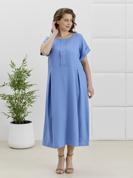 Платье женское из гладкокрашеной плательной ткани, отрезное по линии талии, расширенное книзу, с короткими цельнокроеными рукавами, обработанными манжетами. По центру полочки выполнена декоративная планка, по соединительном шву лифа и юбки заложены встречные складки.