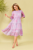 Платье женское полуприлегающего силуэта длиной выше колен. Рукав втачной короткий. По окату рукава сборка. По переду платья кокетка. Ниже линии кокетки пять защипов. Вырез горловины назапах до уровня кокетки. Низ переда декорирован тремя горизонтальными складками. Спинка со средним швом и талиевыми вытачками.