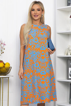 Платье женское прямого силуэта длины миди, с втачным рукавом. Горловина с цельнокроеным воротником стойкой. По горловине и талии вытачки. По переду декоративная планка. Рукав длинный с декоративной планкой из пайеток. По спинке средний шов и потайная застежка молния. В левом боковом шве разрез.