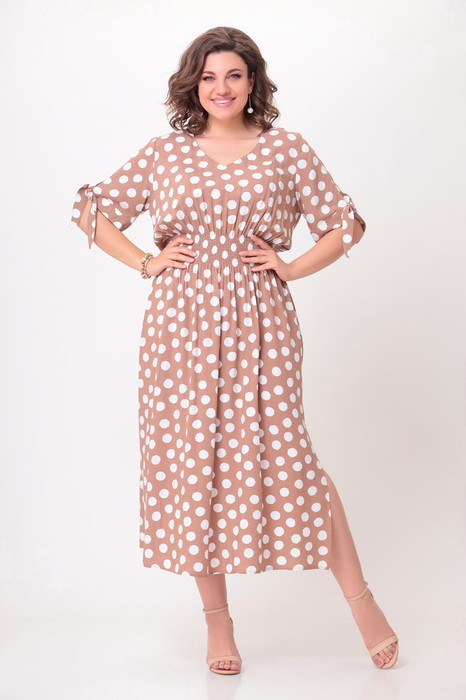Платье женское полуприлегающего силуэта, длиной maksi. Выполнено из вискозной ткани. Перед и спинка платья цельнокроеные. По линии талии, платье собрано на 10 рядов, отстроченных эластичной тесьмой. Перед с V-образной горловиной. Рукав втачной, короткий, с притачной манжетой, переходящей в завязку. В нижней части боковых швов обработаны разрезы.