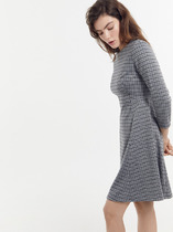 Платье отрезное ниже линии талии.  Верхняя часть выполнена из однотонного полотна, нижняя часть – с дизайном «гусиная лапка».