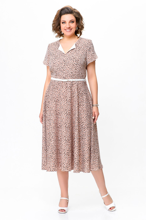Платье А-силуэта, отрезное по линии талии. Платье - из струящейся принтованной плательной ткани. Перед лифа со средним швом и отложным цельнокроеным воротничком, выполненным из контрастной однотонной хлопковой ткани. По переду и спинке лифа расположены рельефы. В среднем шве спинки предусмотрена молния. Рукав втачной короткий формы «тюльпан».
