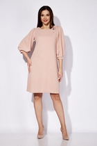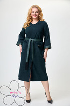 Платье женское из лёгкой ткани, прямого силуэта со съёмным поясом. По переду платья нагрудные выточки, спинка цельная. Вырез горловины овальный, сзади застёжка в виде капельки, на навесную петлю и пуговицу. В пройму вставлены двойные воланы, длина нижнего волана – 15см, верхнего – 12 см. В боковых швах платья разрезы длиной 32 см. Длина платья по спинке 127 см. (+-1 см)