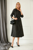 Платье из эластичного трикотажного полотна полуприлегающего силуэта. По переду обработаны нагрудные вытачки. Спинка цельнокроеная. Рукав втачной одношовный длиной 4/5 с манжетой из декоративного трикотажного довяза. В боковых швах обработаны карманы. Горловина V-оборазной формы, обработана декоративным трикотажным довязом.