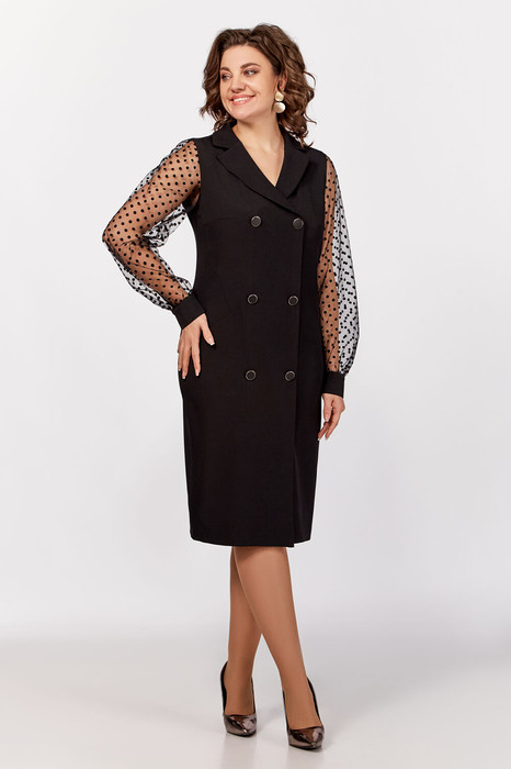 Нарядное платье из поливискозной ткани, полуприлегающего силуэта. Спереди имитация двубортной застёжки с декоративными пуговицами в два ряда. Полочки с фигурными бочками и нагрудными выточками. Спинка с центральным швом и талиевыми выточками. Горловина V-образной формы с отложными лацканами и воротником пиджачного типа. Рукав  втачной длинный из отделочной ткани «сетка», по низу со сборкой и манжетой из основной ткани, застёгивающейся на петлю и  декоративную пуговицу. В боковом шве застёжка на потайную тесьму-молнию.