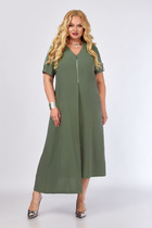 Платье из мягкой вискозной ткани, отрезное по линии талии с полуприлегающим лифом и юбкой А-силуэта, с центральной застёжкой на петли и декоративные пуговицы. Полочка с вертикальными рельефами, спинка с кокеткой и отрезными бочками. Юбка состоит из семи клиньев. По переду между швами обработан карман с планкой на косую. Воротник отложной рубашечного типа, с отрезной стойкой. Рукав втачной короткий, по низу с отложной манжетой.