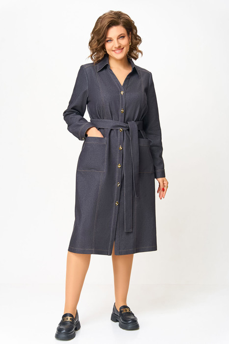 Платье из джинсовой ткани прямого силуэта с центральной застёжкой на петли и джинсовые пуговицы. Полочки с притачными фигурными планками, с рельефным швом и кокеткой, на уровне бёдер накладной карман с планкой и фирменной нашивкой «Swallow».