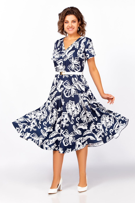 Платье из струящейся вискозной ткани, отрезное по линии талии. Лиф полуприлегающего силуэта. По полочке лифа центральный шов, нагрудные и талиевые вытачки, по спинке средний шов и талиевые вытачки. Горловина V-образной формы с отложным воротничком. Юбка расклешённая. Рукав втачной короткий, формы «тюльпан». В среднем шве спинки застёжка на потайную тесьму-молнию.