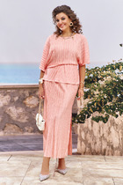 Платье из мягкой шифоновой ткани, на трикотажной подкладке, отрезное по линии талии, шов собран на эластичную тесьму-резинку. Горловина округлой формы, по переду капелька с завязкой. Рукав втачной, короткий.
