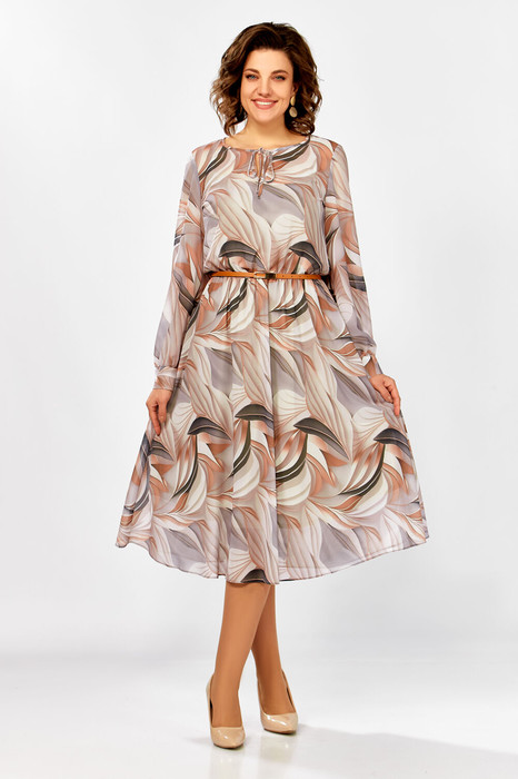 Платье из креп-шифоновой ткани, на трикотажной подкладке, отрезное по линии талии, шов собран на эластичную тесьму-резинку. Горловина округлой формы, по переду капелька с завязкой. Рукав втачной одношовный, внизу со сборкой и манжетой, которая застёгивается на 2 петли и пуговицы.