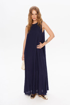 Платье-рубашка свободного силуэта, с рукавом длинной 3/4. Рукав со спущенной линией плеча. По переду кокетка, с отлетной складкой и накладными карманами. На складке- декор вышивка. Горловина оформлена стойкой. Застежка на широкую планку с кнопками. В боковых швах функциональные карманы. По спинке кокетка и мягкая встрачная складка. По бокам разрезы. Низ платья разноуровневый (сзади длиннее) Талию подчеркивает съемный пояс с пряжкой из полукольц.