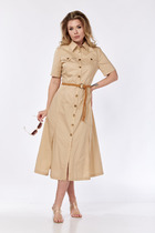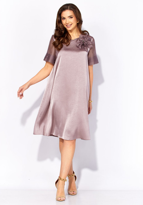 Платье женское ,расширенное к низу, с коротким втачным рукавом. Рукав выполнен из отделочной ткани с тремя складками по низу. Вырез горловины круглой формы с отделочной бейкой спереди. По спинке средний шов и застёжка в шве на потайную тесьму ,,молния". Декором служит съёмный цветок.
