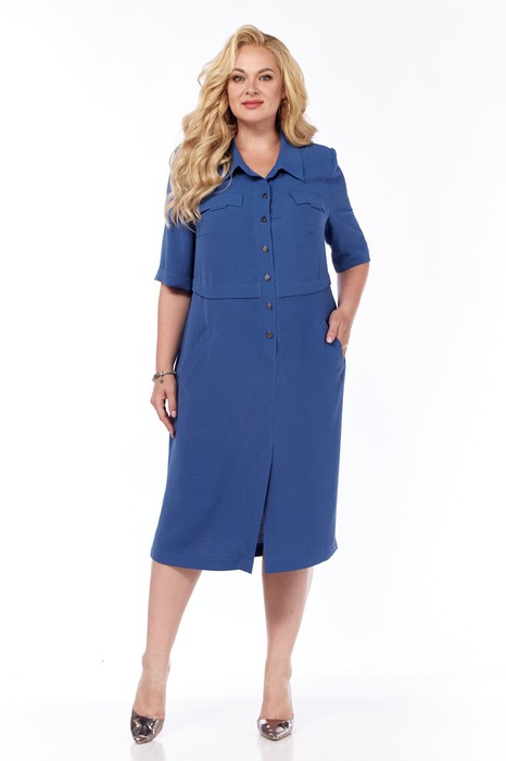 Платье прямого силуэта с застёжкой-планкой на шесть петель и пуговиц. Верх изделия отрезной чуть выше линии талии. На переде обработаны нагрудные вытачки, кокетки, шлица в среднем шве, декоративные клапаны и прорезные карманы с листочкой.