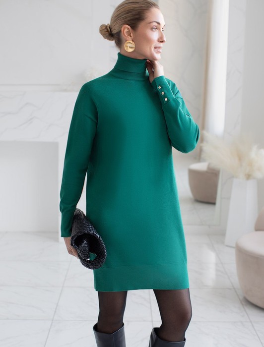 Состав: 82%Хлопок 18%ПА Плотность: 12 GG Параметры модели на первом фото: Рост 172, бюст 88, талия 64, бедра 88 Размер товара на первом фото: 42Платье тонкой вязки выполнено из хлопка. Лаконичная модель с высоким воротом как у водолазки дополнена манжетами с золотистыми пуговицами. Изделие свободно сидит по фигуре и не сковывает движений. Мягкая пряжа очень приятная к телу не колется и сохраняет тепло при этом не перегревая.