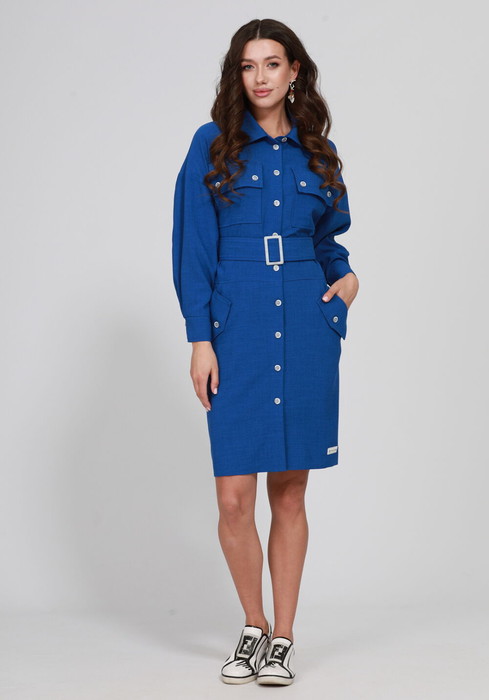 Очаровательное платье прямого силуэта ,со спущенной линий плеча и центральной застежкой. Воротник стояче-отложной, рубашечного типа. Платье с накладмыми карманами с клапанами, застегивающиеся на петли и пуговицы. Низ рукава с притачной манжетой и декоративными пуговицами. В комплеке широкий пояс с декоративной пряжкой.