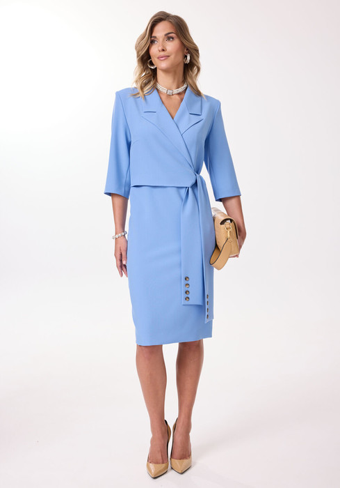 Платье полуприлегающего силуэта, выполненное из плательно-костюмной ткани, длиной миди. Одна из деталей лифа - отлетная, имитирующая образ комплекта "жакет и платье". Перед платья с нагрудными вытачками. Верхняя, жакетная часть платья завязывается на фигурный пояс, декорированный пуговицами. Спинка со средним швом и талиевыми вытачками. В нижней части среднего шва спинки обработана шлица. В левом боковом шве расположена потайная молния. Рукав втачной, двухшовный. Горловина платья оформлена воротником жакетного типа.