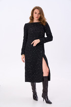 Платье полуприлегающего силуэта, выполненное из плательной поливискозы, длиной 'мидакси". Платье отрезное по линии талии, с центральной застёжкой на петли и пуговицы. Верхняя часть переда платья с фигурной V-образной горловиной, оформленной воротником рубашечного типа. Верхняя часть платья с нагрудными и талиевыми выточками. Нижняя часть переда платья с талиевыми вытачками и со средним швом, внизу которого обработан разрез. Спинка цельнокроеная с талиевыми вытачками. В боковом шве обработана потайная молния в области талии, в области бедер обработаны карманы. Рукав втачной, с цельнокроеной манжетой, длиной 3/4. В комплект к платью входит контрастный ремень с декоративной пряжкой.