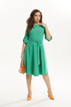 Платье прилегающего силуэта, длиной миди, выполненное из плательной поливискозы. Платье жакетного типа с ассиметричным передом. Одна из сторон переда имитирует жакет и юбку, другая-платье. Перед с талиевыми вытачками с подрезом. В области груди настрочена декоративная листочка, в области бедер - карманы-обманки с листочками и клапаном. По переду обработан разрез. В области талии расположена застёжка на 2 петли и крупные декоративные пуговицы. Спинка  со средним швом, в который вставлена потайная молния. Рукав 2-х шовный втачной, длиной 3/4.