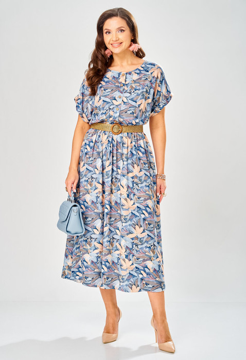Платье женское полуприлегающего силуэта длиной мидакси. Платье с круглой горловиной и со спущенной линией плеча. Нижняя часть плеча, переходящая в цельнокроенный короткий рукав, обработана притачной манжетой. На верхней части переда платья обработаны нагрудные вытачки. Платье с центральной застёжкой на петли и натуральные пуговицы, на притачной планке, обработанной до линии талии. Верхняя часть спинки цельнокроенная. Нижняя часть переда и спинки цельнокроенные. В боковых швах, в области бедер обработаны карманы. По линии талии расположена эластичная резинка, регулирующая прилегание. В комплект к платью входит плетёный декоративный ремень.