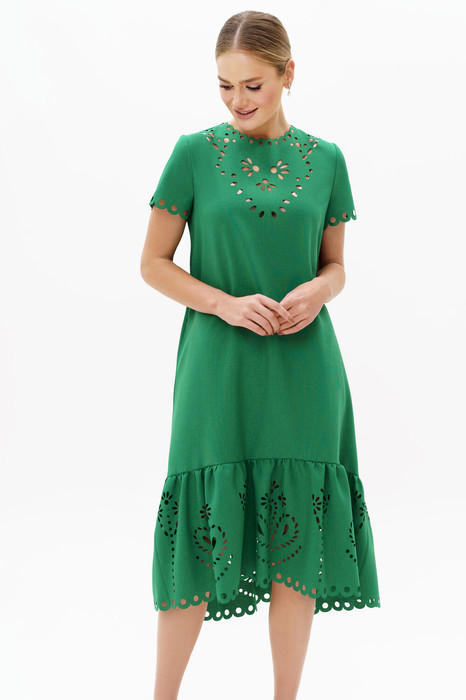 Платье свободное трапециевидного силуэта для повседневной носки с ассиметричным низом, с притачным воланом по низу. Перед без нагрудных вытачек. Спинка со средним швом, в верхней части среднего шва обработана застежка на потайную тесьму-молнию. В боковых швах на уровне линии бедра, обработаны карманы в швах. Рукава втачные одношовные, короткие. Горловина круглой формы. В верхней части переда - отлетная подкладка. По низу волана и рукава, горловине и лифу переда расположена декоративная перфорация. Длина платья по среднему шву спинки до низа - 117,0 см (±3,0 см), Длина рукава платья - 18,0 см (±1,0 см).
