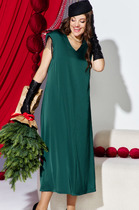 По переду платья идет декоративная отделка - вышивка с объемными элементами. Верхняя часть переда с рельефными швами, выходящими из проймы и идущими до уровня линии талии. Нижняя часть платья переда с одним рельефным швом с левой стороны на продолжении рельефного шва верхней части. По левому рельефному шву идет вышивка с объемными элементами. Левая часть переда - из отделочного материала.