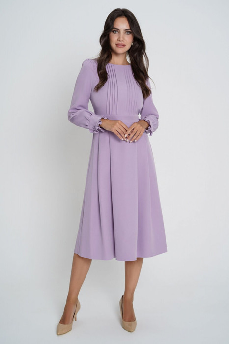 Лаконичный фасон и женственность – две важные особенности. Именно этими словами можно охарактеризовать это платье, которое будет актуально на любом мероприятии. Платье женское полуприлегающего силуэта из костюмно-плательной ткани, может быть как нарядным, так и для повседневной носки. Платье отрезное по линии талии, с притачным поясом. Верхняя часть переда (лиф) с защипами, идущими от горловины до шва притачивания пояса. Нижняя часть переда (юбка) с 2-я парами складок. Спинка со средним швом, в котором обработана застежка на потайную тесьму-молнию. Верхняя часть спинки с талиевыми вытачками, идущими от шва притачивания пояса. Нижняя часть спинки с 2-я парами складок. Рукава втачные, одношовные, длинные. По окату рукава имеется сборка. Низ рукава обработан притачной манжетой, застегивающейся на петлю и пуговицу, рукав по шву притачивания к манжете со сборкой. Манжета с закругленным углом. По нижней части манжеты - рюша. Горловина овальной формы, обработана обтачкой.