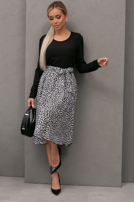 Платье приталенного силуэта. Верхняя часть платья из трикотажного полотна, нижняя из легкой ткани Ниагара. Округлая горловина на внешней обтачке. Длинные втачные рукава. Отрезная линия талии. Низ выполнен в виде юбки колокола, без разрезов. Пояс из основного материала в комплекте.