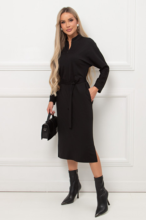 Лаконичное платье прямого силуэта выполнено из трикотажного полотна. Длинный цельнокроеный рукав летучая мышь, оканчивается притачной манжетой. Горловина оформлена воротником - стойка. По переду застежка на потайную молнию. По боковым швам расположены функциональные карманы. Низ ровный, по бокам разрезы. Пояс из основного материала в комплекте.