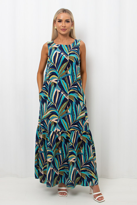 Летнее платье А - силуэта. Округлая горловина на внутренней обтачке. По спинке застежка на потайную молнию. В боковых швах функциональные карманы. Низ оформлен притачным воланом.