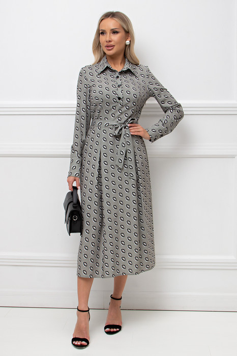 Женственное платье приталенного силуэта. Горловина оформлена отложным воротником на стойке. По переду втачная планка с застежкой на петли и пуговицы. Длинный втачной рукав оканчивается притачной манжетой. Модель отрезная по линии талии, с боку застежка на потайную молнию. Юбка дополнена встречными складками. Пояс из основной ткани в комплекте.