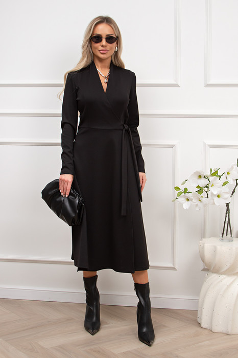 Женственное платье приталенного силуэта изготовлено из трикотажного полотна.V-образная горловина с цельнокроеной стойкой. Втачной рукав длиной 7/8. Модель отрезная по линии талии на запахе, сбоку пояс-завязка. Низ ровный, без разрезов.