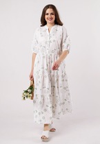Женственное платье приталенного силуэта. Цельнокроенный рукав длинной 3/4 оканчивается притачной манжетой на сборке. Горловина оформлена отложным воротником на стойке переходящим в планку с застежкой на петли и пуговицы. Модель отрезная по линии талии, присборена на резинку. По бокам функциональные карманы. Низ ровный, без разрезов. Пояс из основного материала входит в комплект.