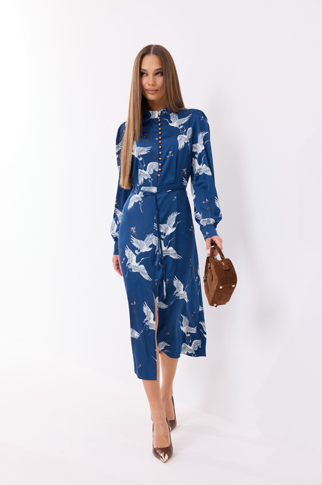 Платье полуприлегающего силуэта с отрезной линией по талии. Длина миди. Нижняя часть на подкладке, спереди разрез (39 см). Застёжка спереди на навесные петли и пуговицы. Воротник стойка. Застёжка на потайную молнию в боковом шве. Верх рукава со складками, понизу сборка, на манжете. Манжета с застёжкой на петли и пуговицы. В боковых швах шлёвки. В комплекте съёмный пояс-тесьма.