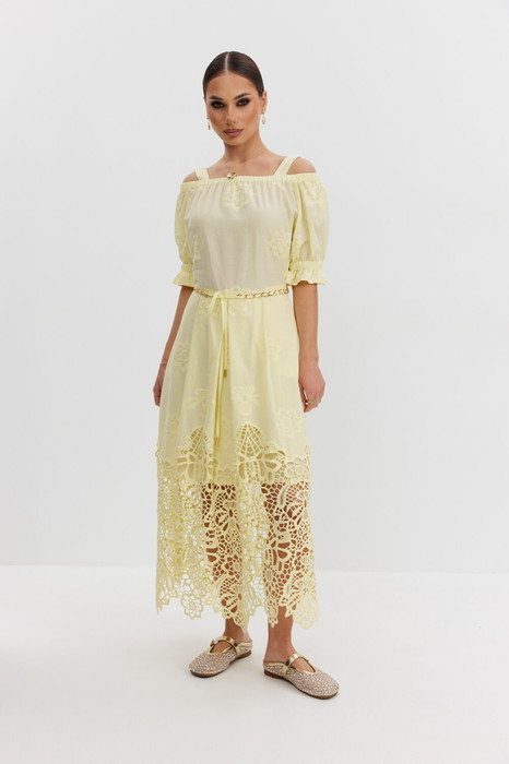 Платье из хлопковой ткани «ришелье». Длина макси. Платье отрезное по талии, юбка со складками. Верх с открытыми плечами и съемными бретелями. Застежка в боковом шве на потайную молнию. Рукав «фонарик». В боковых швах карманы. В комплекте декоративный пояс-завязка. Платье на подкладке. Длина 121 см. Длина спинки до талии - 32 см. Длина рукава 30 см.