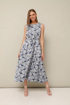 Платье женское полуприлегающего силуэта из трикотажа с декоративной вышивкой по рукавам. Перед с фигурными вытачками, выходящими из бёдер. Спинка со средним швом, заканчивающимся шлицей и с потайной молнией. Рукав втачной со сберкой по окату и низу с двойной манжетой. Длина платья по спинке - 101 см. Длина рукава - 61 см.
