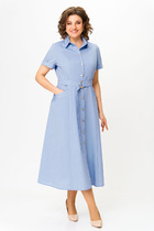Платье женское полуприлегающего силуэта, зауженное к низу. Перед с декоративными кантами из отделочной ткани из проймы до низа и с вытачками из рельефов. Спинка со средним швом, в котором обработана потайная тесьма-молния и шлица. Также по спинке обработаны талиевые вытачки. Рукав втачной длиной 3/4 фантазийной формы на запах, расширенный к низу, двойной. Обтачен отделочной тканью. Горловина овальной формы.