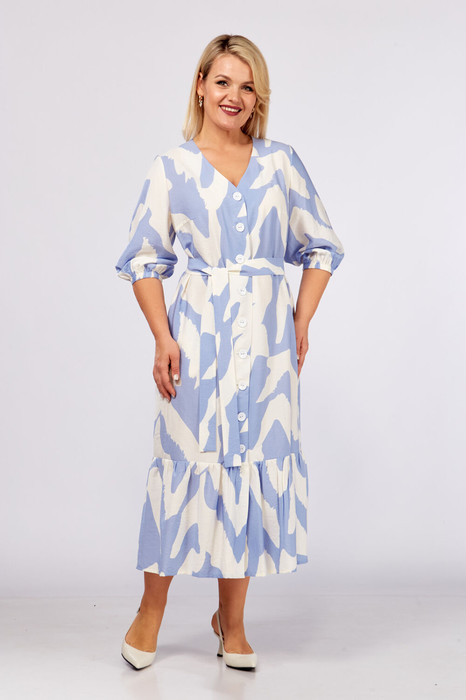 Платье женское А-образного силуэта с естественной линией плеча. Рукав втачной длиной 3/4. Низ рукава обработан резинкой.Горловина V-образной формы. Перед с нагрудной вытачкой и застежкой на петли-пуговицы. По низу переда и спинки обработана оборка. В боковых швах обработаны карманы.В комплект входит съемный пояс.