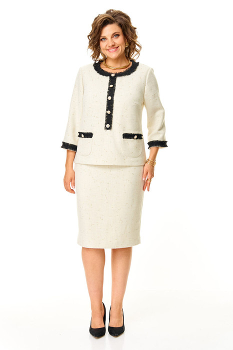 Платье прямого силуэта с естественной линией плеча на трикотажной подкладке. Платье выполнено имитацией жакета и юбки карандаш. Спинка со средним швом и застежкой на молнию. Перед с нагрудными вытачками и накладными карманами. Вырез горловины округлой формы. По горловине и переду настрочены отделочные бейки с необработанным краем. Рукав втачной одношовный длиной 3/4. По низу рукава настрочена отделочная бейка с необработанным краем. На изделие пришиты декоративные пуговицы. Ткань с добавлением шерсти, ворсистой фактуры с вплетением металлизированной нити.