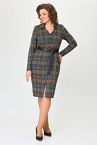 Платье прилегающего силуэта с плавным V-образным вырезом горловины со вставкой резинки и лёгкой сборкой по лифу. Лиф В платье со средним швом. Рукав в платье цельнокроеный. По переду и спинке платья фигурная вставка венгерки с лёгкой сборкой от подрезов. Вставка из венгерки по талии очерчивает силуэт, создавая изящную линию, подчеркивающую природные изгибы. По низу платья разноуровневые воланы со сборкой от подреза. Длина платья от высшей точки плечевого шва до низа 128 см. Длина рукава 42,5 см(р.48-52), 44 см (р.54-58).