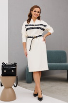 Однотонное платье имеет лёгкий блеск, переливается на свету. Левую часть плеча и груди украшает изысканная вышивка в тон. Длина миди делает его универсальным для различных мероприятий, а отсутствие четко выраженной талии позволяет платью мягко облегать фигуру. Платье А-силуэта, расширяется к низу, линия плеча спущенная. По переду платья вставка с плавным V- образным вырезом и широким отложным воротником. По переду платья застрачивается складка. По спинке платья притачная кокетка с застроченной складкой от подреза. Рукав втачной, в сгиб, с заложенными декоративными складками по окату и к низу. В боковых швах платья карманы. По низу платья широкая подгибка. Длина платья от высшей точки плечевого шва до низа 105,5 см (р 52-56), 107 см (р 58-62). Длина рукава 35 см.
