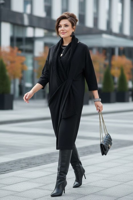 Если Вы ищете идеальное сочетание стиля и комфорта, вот идеальный выбор. Мы специально подобрали качественную и тактильно приятную ткань, которая хорошо держит свою форму, создавая ощущение легкости и свободы движения. Платье свободного силуэта, слегка заужается к низу, с округлой формой горловины, линия плеча спущенная. Главная интрига кроется в декоративной складке в подрезе по переду. Это тщательно продуманный декоративный элемент. Эта складка — свидетельство высокого искусства кройки; она добавляет глубину и динамику лаконичному фасону, создавая иллюзию движения даже в неподвижности. Спинка в платье со средним швом. Рукав в платье втачной, длиной 7/8. Но кульминацией образа становится отдельный декоративный элемент. Шарф, идущий в комплекте, драпируется на шее, являясь частью наряда. Он создаёт завершающий образ.Вместе с платьем они создают диалог текстуры и формы, тем самым завершая образ. Гладкое, платье служит идеальным холстом для струящейся драпировки шарфа. Длина платья 116 см (р.52-56), 117 см (р.58-62), длина рукава 31 см (р.52-56), 30 см (р.58-62).