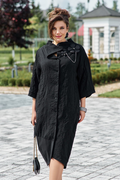 Платье свободного кроя. По переду платья центральная застёжка на петли-пуговицы по борту. Оригинальный высокий воротник, асимметричный, фиксируется при помощи застёжки на потайную кнопку. Линия плеча спущенная. Рукав втачной, длиной 7/8 с притачной манжетой по низу. В боковых швах платья карманы. По правой части переда платья подрез с притачной деталью из однотонной ткани переходящей на спинку платья. Спинка в платье со средним швом. Съемное декоративное украшение в виде стилизованного цветка с цепочками позволяет трансформировать образ. Обращаем Ваше внимание, что фурнитура может незначительно отличаться от фото. Длина платья 105 см, длина рукава 32,5 см (р 52-56), 30,5 см (р 58-62).