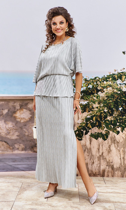 Платье прилегающего силуэта, с округлой формой горловины с ассиметричным подрезом по талии и небольшим напуском. Рукав в платье ассиметричный (левый-цельнокроеный, правый со спущенный проймой через подрез по лифу платья). От подреза притачная баска, юбка платья прямая с разрезом в боковом шве. В боковом шве платья застёжка на тесьму-молнию.Длина платья 135 см. Длина рукава левого 39 см (р.50-54), 40 см (р.56-60). Длина рукава правого 52 см (р.50-54), 53 см (р.56-60)